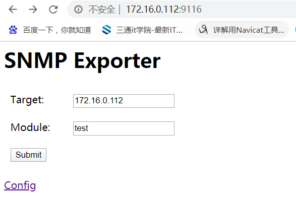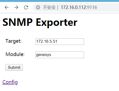 登录snmp_exporter服务端口9116,module是generator.yml中定义的,点击submit确认返回结果