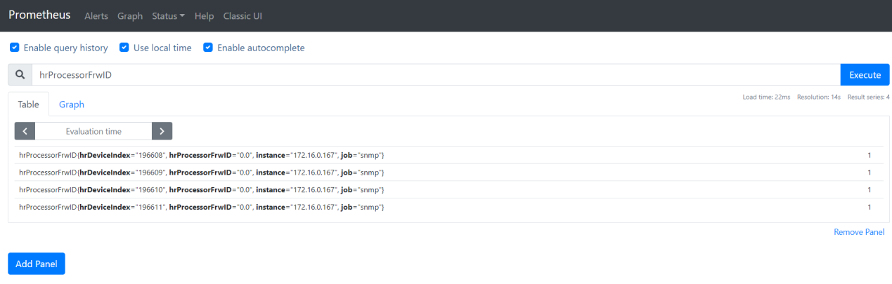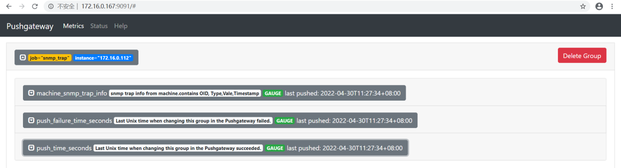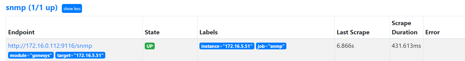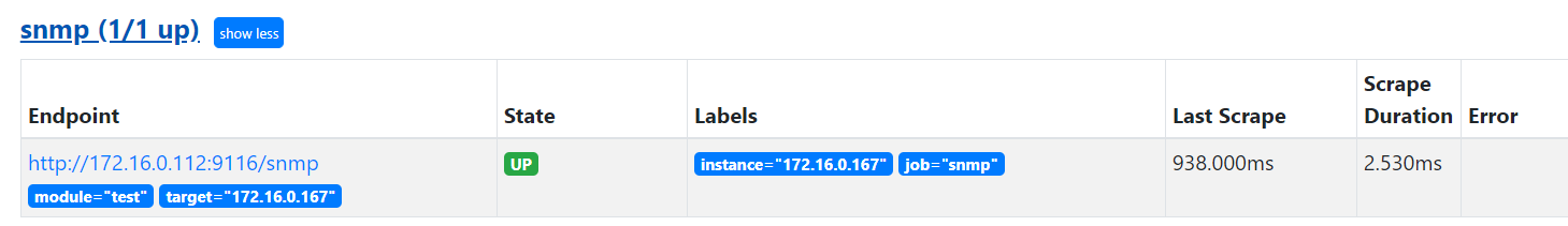 - job_name: 'snmp' scrape_interval: 10s static_configs: - targets: - 172.16.0.167 # 交换机IP地址 metrics_path: /snmp params: module: [test] #generator.yml或SNMP_EXRORTER配置文件中对应的模块 relabel_configs: - source_labels: [__address__] target_label: __param_target - source_labels: [__param_target] target_label: instance - target_label: __address__ replacement: 172.16.0.112:9116 # snmp_exporter 服务IP地址 |