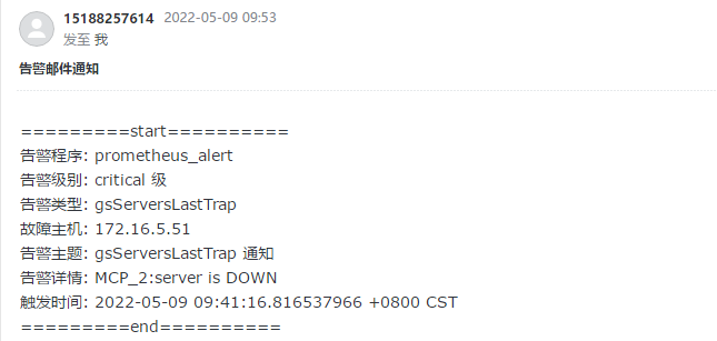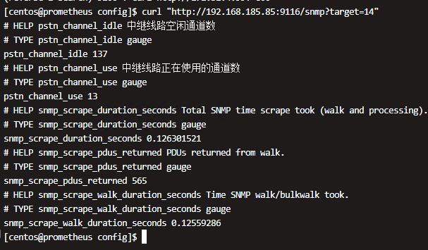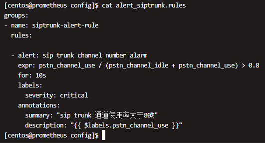 prometheus配置: 说明:14,18,19为三个不同的中继接口。当使用率大于80%后报警。 报警公式: pstn_channel_use / (pstn_channel_idle + pstn_channel_use) > 0.8 ###################### - job_name: snmp honor_timestamps: true scrape_interval: 30s scrape_timeout: 10s metrics_path: /snmp scheme: http static_configs: - targets: - "14" - "18" - "19" relabel_configs: - source_labels: [__address__] separator: ; regex: (.*) target_label: __param_target replacement: $1 action: replace - source_labels: [__param_target] separator: ; regex: (.*) target_label: instance replacement: $1 action: replace - separator: ; regex: (.*) target_label: __address__ replacement: 192.168.185.85:9116 action: replace ################################## |
