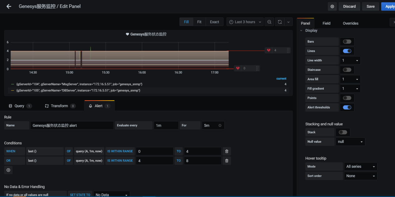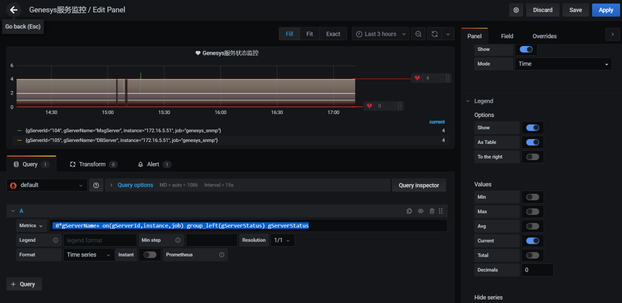 gsServersLastTrap{gsServersLastTrap="confserv:server is DOWN", instance="172.16.5.51", job="genesys_snmp"}