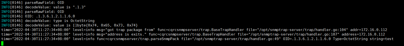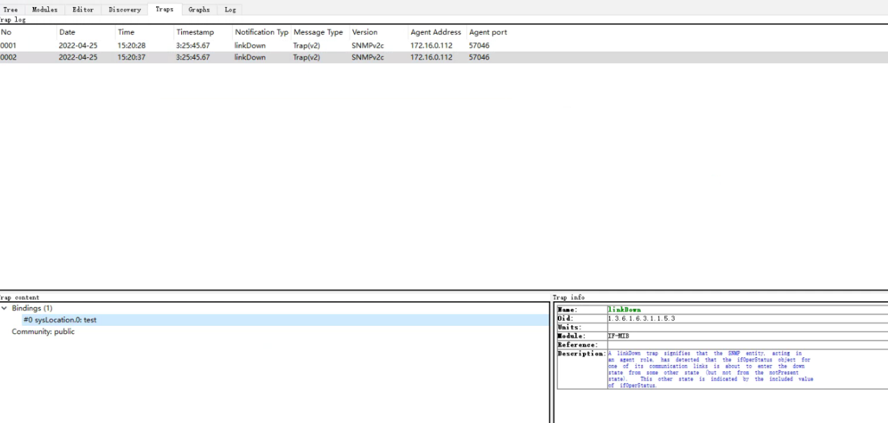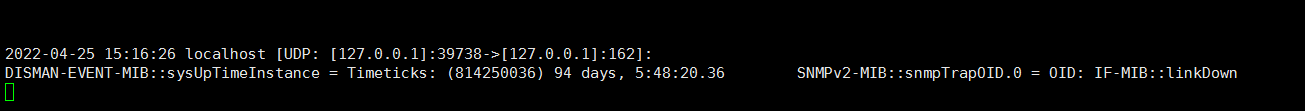 vi /etc/snmp/snmptrapd.conf authCommunity log,execute,net public # systemctl start snmptrapd # systemctl enable snmptrapd 或者 snmptrapd -C -c /etc/snmp/snmptrapd.conf -Lf /var/log/net-snmptrap.log netstat -nlp|grep 162 pkill -9 snmptrapd 现在您已经设置好了,让我们抛出一个 SNMP 陷阱来测试脚本是否运行。 当指定 linkDown 的 OID 时就是这种情况。 snmptrap -v 2c -c public 127.0.0.1 '' .1.3.6.1.6.3.1.1.5.3 然后我们再去我们的日志查看 cat/var/log/snmptrap/snmptrap.log