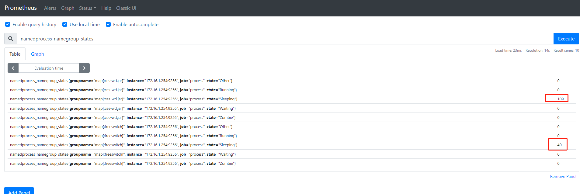 ….. - job_name: 'process' scrape_interval: 2m scrape_timeout: 120s static_configs: file_sd_configs: - files: - /data/prometheus/config/process_exporter.json ….. [root@harbor config]# cat process_exporter.json [ { "labels": { "desc": "ces-wd", "group": "ces-wd.jar", "host_ip": "172.16.1.254", "hostname": "abc_baidu" }, "targets": [ "172.16.1.254:9256" ] }, { "labels": { "desc": "freeswitch", "group": "freeswitch", "host_ip": "172.16.1.254", "hostname": "abc_baidu" }, "targets": [ "172.16.1.254:9256" ] } ] |
