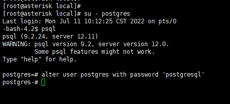 yum install https://download.postgresql.org/pub/repos/yum/reporpms/EL-7-x86_64/pgdg-redhat-repo-latest.noarch.rpm yum install postgresql12-server postgresql12 初始化数据库,初始化数据库命令会在 /var/lib/pgsql 目录下创建名称为12文件夹,11为数据库版本,如果安装的是其他版本,对应的是其版本号(9.4、9.5) /usr/pgsql-12/bin/postgresql-12-setup initdb 设置开机启动并启动 systemctl enable postgresql-12 && systemctl start postgresql-12 安装完成后,默认会创建一个名为postgres的linux登录用户 默认postgresql不允许远程连接,修改配置,使远程用户可以连接 vim /var/lib/pgsql/12/data/postgresql.conf listen_addresses = '*' vim /var/lib/pgsql/12/data/pg_hba.conf # IPv4 local connections: host all all 0.0.0.0/0 md5 重启生效 systemctl restart postgresql-12 修改数据库用户密码 使用postgres用户登录,并设置postgres用户密码 su – postgres postgres=# ALTER USER postgres WITH PASSWORD 'pgsql123'; psqlpostgres=# select usename,passwd from pg_shadow; postgres=# SELECT datname FROM pg_database; 使用\q可以退出终端 访问测试 bash-4.2$ psql -d postgres -U postgres -h 172.16.1.111 Password for user postgres: psql (9.2.24, server 12.11) WARNING: psql version 9.2, server version 12.0. Some psql features might not work. Type "help" for help. postgres=#
