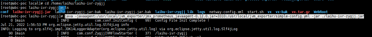 cd /usr/local mkdir jvm_exporter vim simple-config.yml --- wercaseOutputLabelNames: true lowercaseOutputName: true whitelistObjectNames: ["java.lang:type=OperatingSystem"] rules: - pattern: 'java.lang<type=OperatingSystem><>((?!process_cpu_time)\w+):' name: os_$1 type: GAUGE attrNameSnakeCase: true 或者使用下面配置 -- 比如我有一个rms的java应用,启动方式为: java -jar /data/rms/RMS.jar 使用JMX Exporter插件收集数据,需要改成这样: java -javaagent:/usr/local/jmx_exporter/jmx_prometheus_javaagent-0.12.0.jar=3010:/usr/local/jmx_exporter/simple-config.yml -jar /data/rms/RMS.jar 注意:3010是代理端口,可以随意指定。 或者下面已遵义公积金ivr流程为例 java -javaagent:/usr/local/jvm_exporter/jmx_prometheus_javaagent-0.12.0.jar=3310:/usr/local/jvm_exporter/simple-config.yml -jar ./laihu-ivr-zygjj.jar