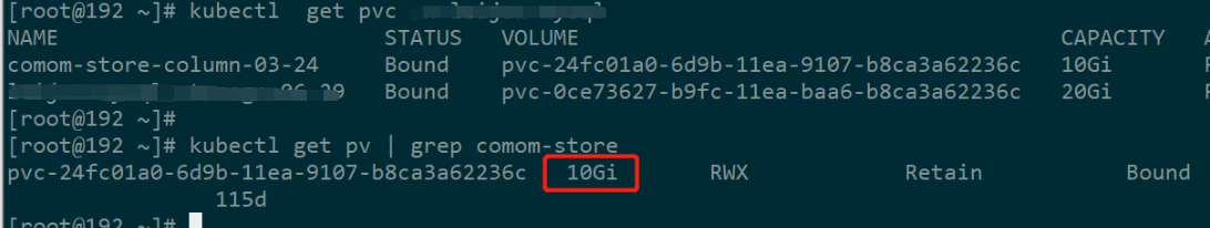 最开始的10g太小了,现在想扩容pv空间 1、kubernetes 1.11版本中开始支持pvc创建后的扩容 先查看storageclass是否配置了动态扩容,主要看storageclass是否存在allowVolumeExpansion字段 ``` [[email protected] ~]# kubectl get storageclass default -oyaml apiVersion: storage.k8s.io/v1 kind: StorageClass metadata: name: default parameters: archiveOnDelete: "false" provisioner: nfs-client-provisioner-default reclaimPolicy: Delete volumeBindingMode: Immediate [[email protected] ~]# ``` 可以看到并没有allowVolumeExpansion,此时是不支持动态扩容的,可以扩一下测试看看 ``` [[email protected] ~]# kubectl edit pvc -n leijun-mysql comom-store-column-03-24 # Please edit the object below. Lines beginning with a '#' will be ignored, # and an empty file will abort the edit. If an error occurs while saving this file will be # reopened with the relevant failures. # apiVersion: v1 kind: PersistentVolumeClaim metadata: name: comom-store-column-03-24 namespace: default spec: accessModes: - ReadWriteMany dataSource: null resources: requests: storage: 50Gi volumeName: pvc-24fc01a0-6d9b-11ea-9107-b8ca3a62236c status: accessModes: - ReadWriteMany capacity: storage: 10Gi phase: Bound "/tmp/kubectl-edit-fkm33.yaml" 38L, 1180C written error: persistentvolumeclaims "comom-store-column-03-24" could not be patched: persistentvolumeclaims "comom-store-column-03-24" is forbidden: only dynamically provisioned pvc can be resized and the storageclass that provisions the pvc must support resize You can run `kubectl replace -f /tmp/kubectl-edit-fkm33.yaml` to try this update again. [[email protected] ~]# ``` ``` kubectl edit pvc -n leijun-mysql comom-store-column-03-24 修改storage 字段再保存,报错了,表示不支持动态扩容 ``` 2、给storageclass添加allowVolumeExpansion字段 ```yml [[email protected] ~] apiVersion: storage.k8s.io/v1 kind: StorageClass metadata: name: default parameters: archiveOnDelete: "false" provisioner: nfs-client-provisioner-default reclaimPolicy: Delete volumeBindingMode: Immediate allowVolumeExpansion: true ~ "/tmp/kubectl-edit-x0fyj.yaml" 24L, 738C written storageclass.storage.k8s.io/default edited [[email protected] ~] ``` 3、再次修改pvc spec.resources.requests.storage字段 ```yml [[email protected] ~] spec: accessModes: - ReadWriteMany dataSource: null resources: requests: storage: 30Gi volumeName: pvc-24fc01a0-6d9b-11ea-9107-b8ca3a62236c status: accessModes: - ReadWriteMany capacity: storage: 10Gi phase: Bound "/tmp/kubectl-edit-mibh7.yaml" 38L, 1180C written persistentvolumeclaim/comom-store-column-03-24 edited [[email protected] ~] ```