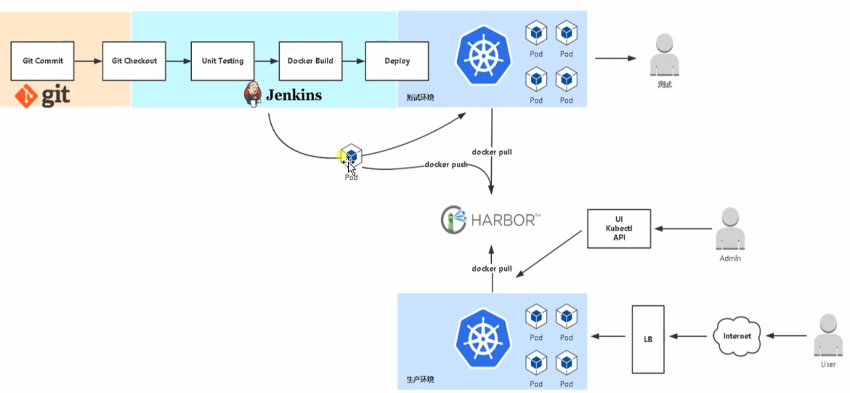 - 开发人员把做好的 knight.blog.csdn.net 项目代码通过git推送到gitlab - 然后Jenkins通过 gitlab webhook (前提是配置好),自动从拉取gitlab上面拉取代码下来。(作用是实现本地 git push 后 jenkins 自动构建部署服务) - 然后进行build,编译、生成镜像、然后把镜像推送到Harbor仓库; - 然后在部署的时候通过k8s拉取Harbor上面的代码进行创建容器和服务,最终发布完成,然后可以用外网访问 > 第一阶段,获取代码(Git) 第二阶段,编译打包(Maven) 第三阶段,镜像打包与推送到仓库 (Harbor) > > 第四阶段,部署应用到k8s集群 (kubectl)  ### pipeline 的编写 ```Go pipeline{ environment{ // 定义变量,或从Jenkins传入进来的变量 } agent{ node{ // 选择 k8s 集群节点 } } stages{ stage('获取代码'){ steps{ // 拉取项目程序源码 } } stage('代码编译打包'){ steps{ container("maven") { // 使用 maven 容器,编译打包 } } } stage('镜像构建推送'){ steps{ container("kaniko") { // 使用 kaniko 容器, docker镜像编译与推送到镜像仓库 } } } stage('获取部署配置'){ steps{ // 拉取 yaml 部署文件 } } stage('应用部署到K8S集群') { steps { container('kubectl') { // 使用 kubectl 容器, 执行 yaml 部署文件,部署应用到 k8s集群 } } } } } ```  形象图描述如下:  ### 命令流程 ```bash export JENKINS_HOME="/root/.jenkins/workspace/springboot-jenkins" export JENKINS_VERSION="v0.1" echo "JENKINS_HOME:${JENKINS_HOME},JENKINS_VERSION:${JENKINS_VERSION}" echo "开始打包" mvn clean mvn package echo "开始制作镜像" docker build -t 你的私有Harbor地址/knight/jenkins:$JENKINS_VERSION $JENKINS_HOME echo "开始推镜像" docker push 你的私有Harbor地址/knight/jenkins:$JENKINS_VERSION echo "开始运行镜像" kubectl apply -f $JENKINS_HOME/build/jenkins-svc.yaml # 使用envsubst传递export的参数 envsubst < $JENKINS_HOME/build/jenkins-deployment.yaml | kubectl apply -f - ``` **编写DockerFile:** ```bash # Java8镜像 FROM knight/base:latest WORKDIR / # 将系统编码设置为c.utf-8,默认的POSIX不支持中文 ENV LANG C.UTF-8 ENV LANGUAGE C.UTF-8 ENV LC_ALL C.UTF-8 # 将子项目打包的jar包拷贝到项目根目录 COPY target/springboot-jenkins-0.0.1-SNAPSHOT.jar /jenkins.jar # 设置容器启动时执行的命令,-Dfile.encoding=utf-8 CMD ["java", "-jar", "jenkins.jar"] ``` 编写暴露端口的Service:jenkins-svc.yaml ```bash apiVersion: v1 kind: Service metadata: name: jenkinks-service labels: app: jenkinks-service spec: type: NodePort ports: - port: 8888 name: jenkinks-service targetPort: 8888 nodePort: 32088 protocol: TCP selector: app: jenkinks-service ``` 编写Deployment: jenkins-svc.yaml ```bash apiVersion: apps/v1 kind: Deployment metadata: name: jenkinks-deployment spec: replicas: 1 selector: matchLabels: name: jenkinks-service template: metadata: labels: name: jenkinks-service app: jenkinks-service spec: containers: - name: jeecg image: 你的私有Harbor地址/knight/jenkins:$JENKINS_VERSION imagePullPolicy: IfNotPresent ports: - containerPort: 8888 ``` ### 参考 ```bash # 参考1 https://www.cnblogs.com/shawhe/p/11313633.html ```