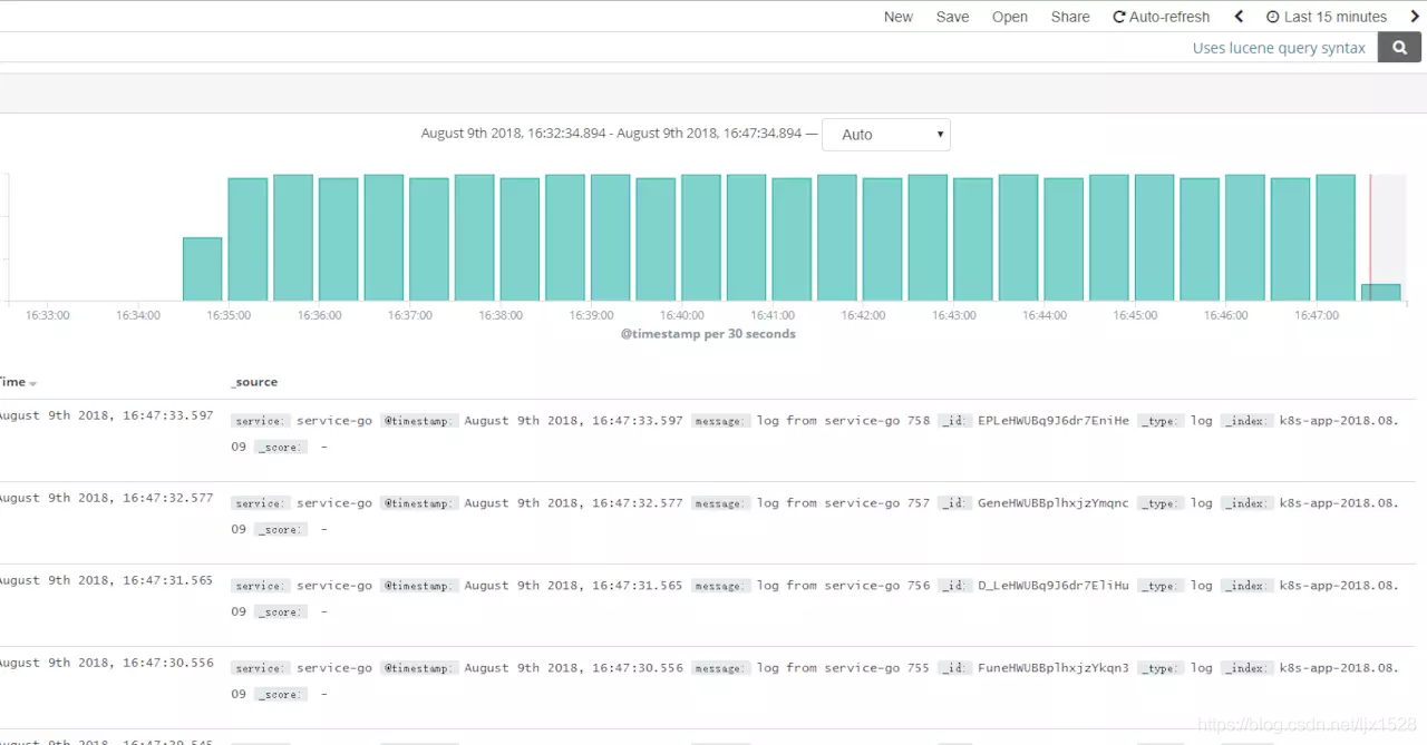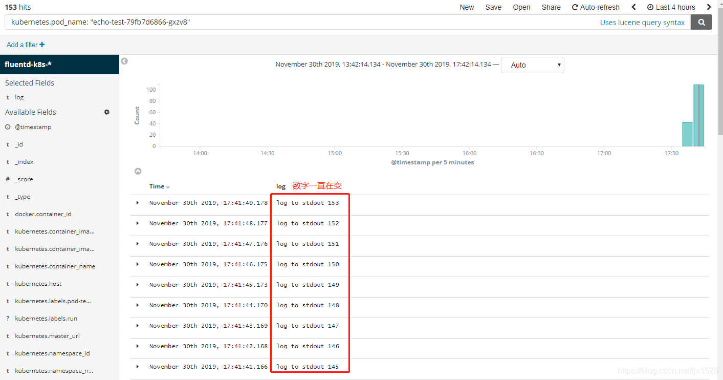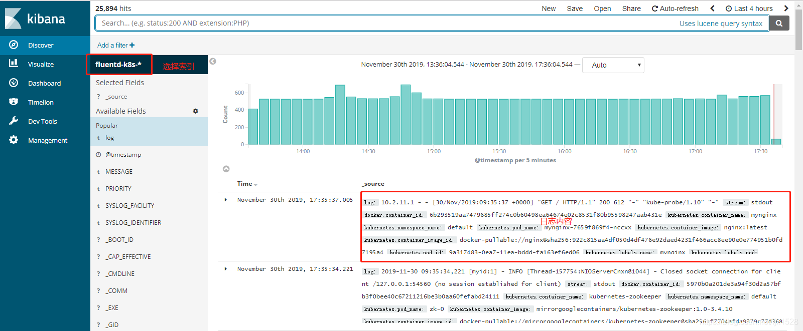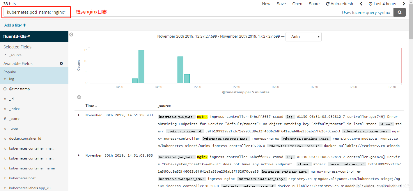 一、k8s收集日志方案简介 本文主要介绍在k8s中收集应用的日志方案,应用运行中日志,一般情况下都需要收集存储到一个集中的日志管理系统中,可以方便对日志进行分析统计,监控,甚至用于机器学习,智能分析应用系统问题,及时修复应用所存在的问题。 在k8s集群中应用一般有如下日志输出方式 直接遵循docker官方建议把日志输出到标准输出或者标准错误输出 输出日志到容器内指定目录中 应用直接发送日志给日志收集系统 本文会综合部署上述日志收集方案。 日志收集组件说明 elastisearch 存储收集到的日志 kibana 可视化收集到的日志 logstash 汇总处理日志发送给elastisearch 存储 filebeat 读取容器或者应用日志文件处理发送给elastisearch或者logstash,也可用于汇总日志 fluentd 读取容器或者应用日志文件处理发送给elastisearch,也可用于汇总日志 fluent-bit 读取容器或者应用日志文件处理发送给elastisearch或者fluentd 二、部署 本次实验使用了3台虚拟机做k8s集群,每台虚拟机8C16G内存 1、部署前准备工作 ``` # 拉取文件 yum -y install git #服务器没有git命令直接安装即可,有请忽略 git clone https://github.com/mgxian/k8s-log.git cd k8s-log git checkout v1 # 创建 logging namespace kubectl apply -f logging-namespace.yaml ``` 2、部署elastisearch ``` 注意: # 本次部署虽然使用 StatefulSet 但是没有使用pv进行持久化数据存储 # pod重启之后,数据会丢失,生产环境一定要使用pv持久化存储数据 # 部署 kubectl apply -f elasticsearch.yaml # 查看状态 kubectl get pods,svc -n logging -o wide [root@k8s-node1 k8s-log]# kubectl get pods,svc -n logging -o wide NAME READY STATUS RESTARTS AGE IP NODE pod/elasticsearch-logging-0 1/1 Running 0 20h 10.2.11.85 192.168.29.182 pod/elasticsearch-logging-1 1/1 Running 0 10h 10.2.11.91 192.168.29.182 NAME TYPE CLUSTER-IP EXTERNAL-IP PORT(S) AGE SELECTOR service/elasticsearch-logging ClusterIP 10.1.84.47 <none> 9200/TCP 20h k8s-app=elasticsearch-logging # 等待所有pod变成running状态 # 访问测试 # 如果测试都有数据返回代表部署成功 [root@k8s-node1 k8s-log]# kubectl run curl -n logging --image=radial/busyboxplus:curl -i --tty If you don't see a command prompt, try pressing enter. [ root@curl-775f9567b5-hpslj:/ ]$ [ root@curl-775f9567b5-hpslj:/ ]$ nslookup elasticsearch-logging Server: 10.1.0.2 Address 1: 10.1.0.2 coredns.kube-system.svc.cluster.local Name: elasticsearch-logging Address 1: 10.1.84.47 elasticsearch-logging.logging.svc.cluster.local #查看集群状态 [ root@curl-775f9567b5-hpslj:/ ]$ curl 'http://elasticsearch-logging:9200/_cluster/health?pretty' { "cluster_name" : "kubernetes-logging", "status" : "green", #green说明集群很健康 "timed_out" : false, "number_of_nodes" : 2, "number_of_data_nodes" : 2, "active_primary_shards" : 131, "active_shards" : 262, "relocating_shards" : 0, "initializing_shards" : 0, "unassigned_shards" : 0, "delayed_unassigned_shards" : 0, "number_of_pending_tasks" : 0, "number_of_in_flight_fetch" : 0, "task_max_waiting_in_queue_millis" : 0, "active_shards_percent_as_number" : 100.0 } #查看集群node节点 [ root@curl-775f9567b5-hpslj:/ ]$ curl 'http://elasticsearch-logging:9200/_cat/nodes' 10.2.11.91 58 92 7 1.61 0.89 0.57 mdi - elasticsearch-logging-1 10.2.11.85 65 92 7 1.61 0.89 0.57 mdi * elasticsearch-logging-0 exit # 清理测试 kubectl delete deploy curl -n logging ``` 3、部署kibana ``` # 部署 kubectl apply -f kibana.yaml # 查看状态 kubectl get pods,svc -n logging -o wide [root@k8s-node1 k8s-log]# kubectl get pods,svc -n logging -o wide NAME READY STATUS RESTARTS AGE IP NODE pod/elasticsearch-logging-0 1/1 Running 0 20h 10.2.11.85 192.168.29.182 pod/elasticsearch-logging-1 1/1 Running 0 10h 10.2.11.91 192.168.29.182 pod/kibana-logging-6c49699bc7-sdkvn 1/1 Running 0 20h 10.2.1.136 192.168.29.176 NAME TYPE CLUSTER-IP EXTERNAL-IP PORT(S) AGE SELECTOR service/elasticsearch-logging ClusterIP 10.1.84.47 <none> 9200/TCP 20h k8s-app=elasticsearch-logging service/kibana-logging NodePort 10.1.116.28 <none> 5601:9001/TCP 20h k8s-app=kibana-logging # 访问测试 # 浏览器访问下面输出的地址 看到 kibana 界面代表正常 # 192.168.29.176 为集群中某个 node 节点ip KIBANA_NODEPORT=$(kubectl get svc -n logging | grep kibana-logging | awk '{print $(NF-1)}' | awk -F[:/] '{print $2}') echo "http://192.168.29.176:$KIBANA_NODEPORT/" ``` 说明:出现如下图示说明kibana启动正常  4、部署fluentd收集日志 ``` # fluentd 以 daemoset 方式部署 # 在每个节点上启动fluentd容器,收集k8s组件,docker以及容器的日志 # 给每个需要启动fluentd的节点打相关label # kubectl label node lab1 beta.kubernetes.io/fluentd-ds-ready=true kubectl label nodes --all beta.kubernetes.io/fluentd-ds-ready=true # 部署 kubectl apply -f fluentd-es-configmap.yaml kubectl apply -f fluentd-es-ds.yaml # 查看状态 kubectl get pods,svc -n logging -o wide [root@k8s-node1 k8s-log]# kubectl get pods,svc -n logging -o wide NAME READY STATUS RESTARTS AGE IP NODE pod/elasticsearch-logging-0 1/1 Running 0 20h 10.2.11.85 192.168.29.182 pod/elasticsearch-logging-1 1/1 Running 0 10h 10.2.11.91 192.168.29.182 pod/fluentd-es-v2.2.0-bb5t4 1/1 Running 0 20h 10.2.11.87 192.168.29.182 pod/fluentd-es-v2.2.0-lvkhj 1/1 Running 0 20h 10.2.1.137 192.168.29.176 pod/kibana-logging-6c49699bc7-sdkvn 1/1 Running 0 20h 10.2.1.136 192.168.29.176 ``` 5、kibana查看日志 5.1、创建index fluentd-k8s-\*,由于需要拉取镜像启动容器,可能需要等待几分钟才能看到索引和数据   5.2、查看日志  #检索nginx日志  6、应用日志收集测试 6.1、应用日志输出到标准输出测试 ``` # 启动测试日志输出 kubectl run echo-test --image=radial/busyboxplus:curl -- sh -c 'count=1;while true;do echo log to stdout $count;sleep 1;count=$(($count+1));done' # 查看状