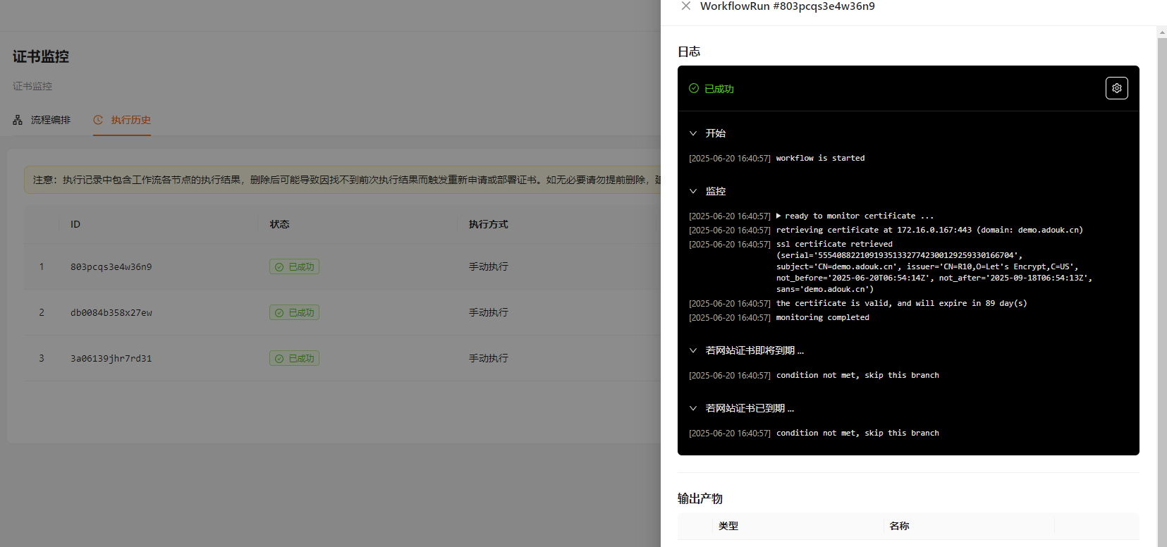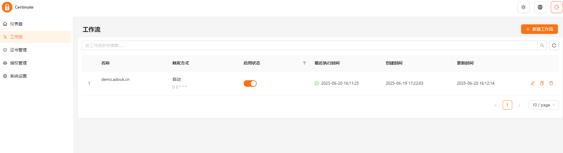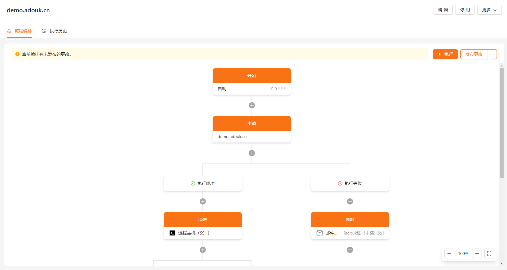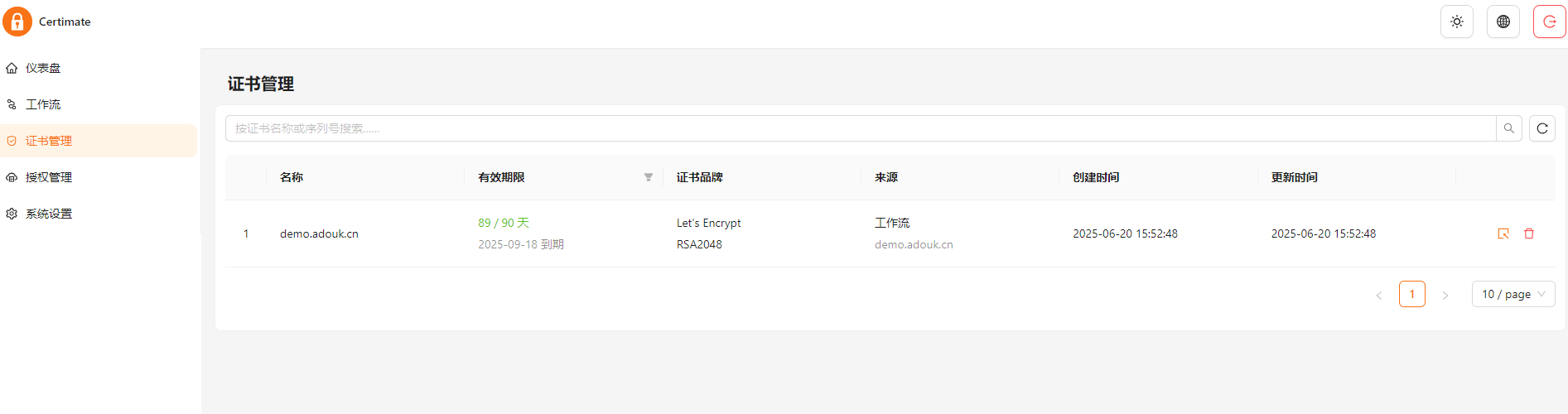 https://github.com/usual2970/certimate/releases/download/v0.3.18/certimate_v0.3.18_linux_amd64.zip <h1 align="center">🔒 Certimate</h1> <div align="center"> [](https://github.com/usual2970/certimate) [](https://github.com/usual2970/certimate) [](https://hub.docker.com/r/usual2970/certimate) [](https://github.com/usual2970/certimate/releases) [](https://mit-license.org/) </div> <div align="center"> 中文 | [English](README_EN.md) </div> --- ## 🚩 项目简介 做个人产品或者在中小企业里负责运维的同学,会遇到要管理多个域名的情况,需要给域名申请证书。但是手动申请证书有以下缺点: - 😱 麻烦:申请证书并部署到服务的流程虽不复杂,但也挺麻烦的,尤其是你有多个域名需要维护的时候。 - 😭 易忘:另外当前免费证书的有效期只有 90 天,这就要求你定期的操作,增加了工作量的同时,你也很容易忘掉续期,从而导致网站访问不了。 Certimate 就是为了解决上述问题而产生的,它具有以下优势: - **本地部署**:一键安装,只需要下载二进制文件,然后直接运行即可。同时也支持 Docker 部署、源代码部署等方式。 - **数据安全**:由于是私有部署,所有数据均存储在自己的服务器上,不会经过第三方,确保数据的隐私和安全。 - **操作简单**:简单配置即可轻松申请 SSL 证书并部署到指定的目标上,在证书即将过期前自动续期,从申请证书到使用证书完全自动化,无需人工操作。 Certimate 旨在为用户提供一个安全、简便的 SSL 证书管理解决方案。 ## 💡 功能特性 - 灵活的工作流编排方式,证书从申请到部署完全自动化; - 支持单域名、多域名、泛域名证书,可选 RSA、ECC 签名算法; - 支持 PEM、PFX、JKS 等多种格式输出证书; - 支持 30+ 域名托管商(如阿里云、腾讯云、Cloudflare 等,[点此查看完整清单](https://docs.certimate.me/docs/reference/providers#supported-dns-providers)); - 支持 100+ 部署目标(如 Kubernetes、CDN、WAF、负载均衡等,[点此查看完整清单](https://docs.certimate.me/docs/reference/providers#supported-hosting-providers)); - 支持邮件、钉钉、飞书、企业微信、Webhook 等多种通知渠道; - 支持 Let's Encrypt、Buypass、Google Trust Services、SSL.com、ZeroSSL 等多种 ACME 证书颁发机构; - 更多特性等待探索。 ## ⏱️ 快速启动 **5 分钟部署 Certimate!** 以二进制部署为例,从 [GitHub Releases](https://github.com/usual2970/certimate/releases) 页面下载预先编译好的二进制可执行文件压缩包,解压缩后在终端中执行: ```bash ./certimate serve ``` 浏览器中访问 `http://127.0.0.1:8090`。 初始的管理员账号及密码: - 账号:`admin@certimate.fun` - 密码:`1234567890` 即刻使用 Certimate。 如何使用 Docker 或其他部署方式请参考文档。 ## 📄 使用手册 请访问文档站 [docs.certimate.me](https://docs.certimate.me/) 以阅读使用手册。 相关文章: - [使用 CNAME 完成 ACME DNS-01 质询](https://docs.certimate.me/blog/cname) - [v0.3.0:第二个不向后兼容的大版本](https://docs.certimate.me/blog/v0.3.0) - [v0.2.0:第一个不向后兼容的大版本](https://docs.certimate.me/blog/v0.2.0) - [Why Certimate?](https://docs.certimate.me/blog/why-certimate) ## ⭐ 运行界面 [](https://www.bilibili.com/video/BV1xockeZEm2) ## 实战演示-阿里云续签 # 准备工作-阿里云账号授权 在RAM 访问控制创建一个用户,并授权AliyunDNSFullAccess权限,留存AccessKey ID和Secret   # 授权管理配置 填写阿里云上申请到的用户key信息  主机信息就写到本地机器上,用于上传证书和更新操作  设置通知渠道,比如邮箱,企业微信等  证书颁发机构这里就使用免费内置的lets证书,其他收费的需要填写相关认证信息 # 工作流证书申请   根据实际工作场景配置工作流 开始,设定自动触发和手动触发模式,一般建议自动,选择更新时间即可  证书申请,域名可以是单个也可以是通配符证书,DNS的等待检查时间需要配置上,阿里云需要较长时间,超时后则会异常  比如未填写等待时长,出现下面的错误  根据定义设置部署成功或失败的通知对象,完成后进行发布,然后执行,或自动运行  在右侧有执行历史,可以查看执行的日志  # 证书管理  # 证书监控通知