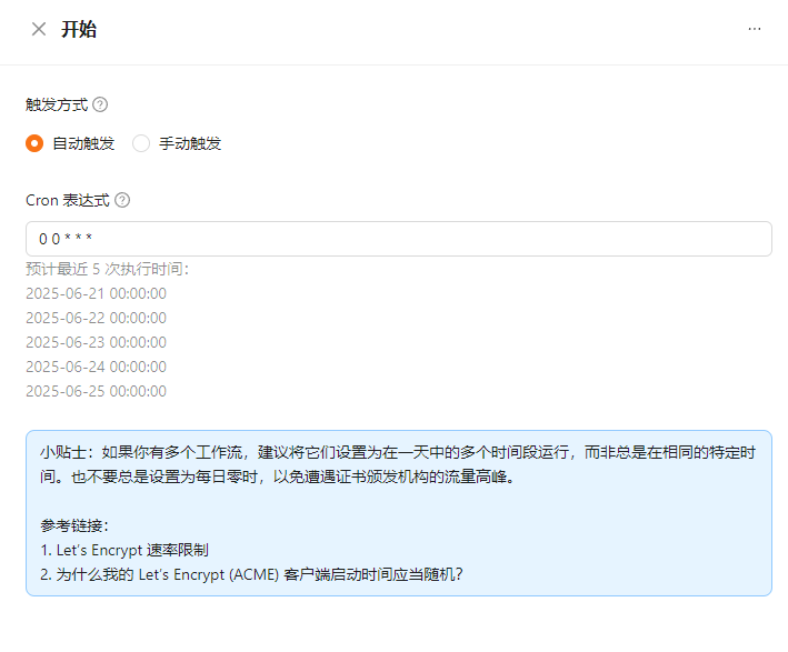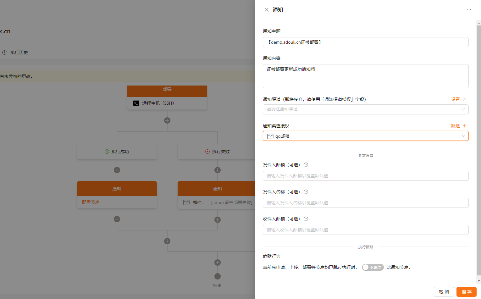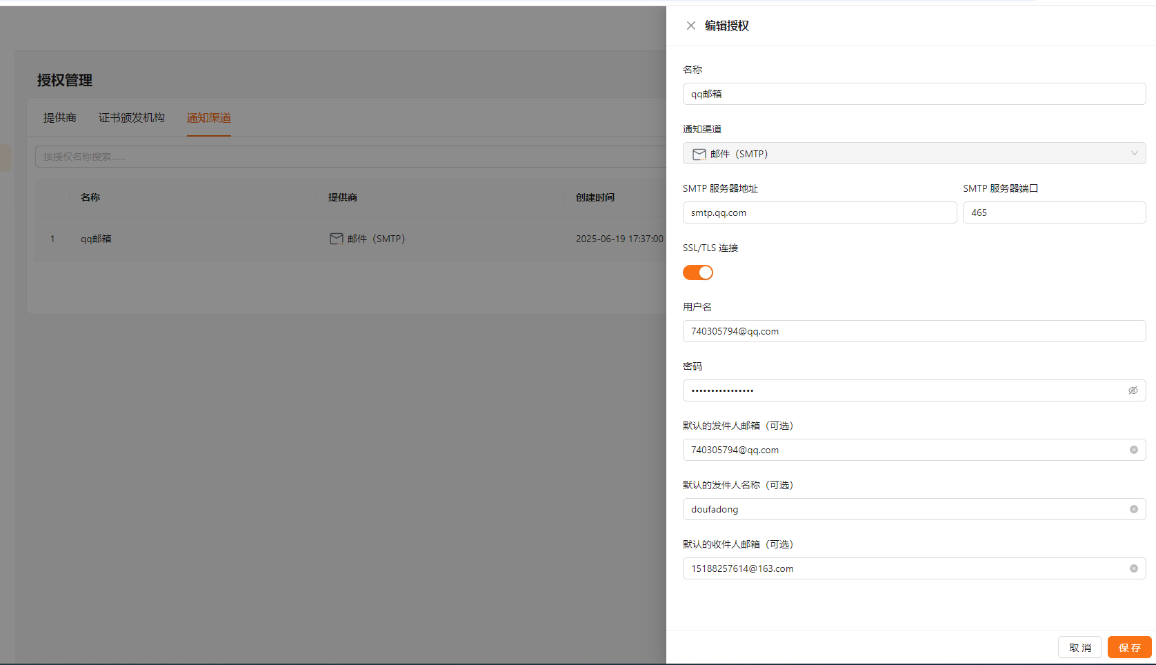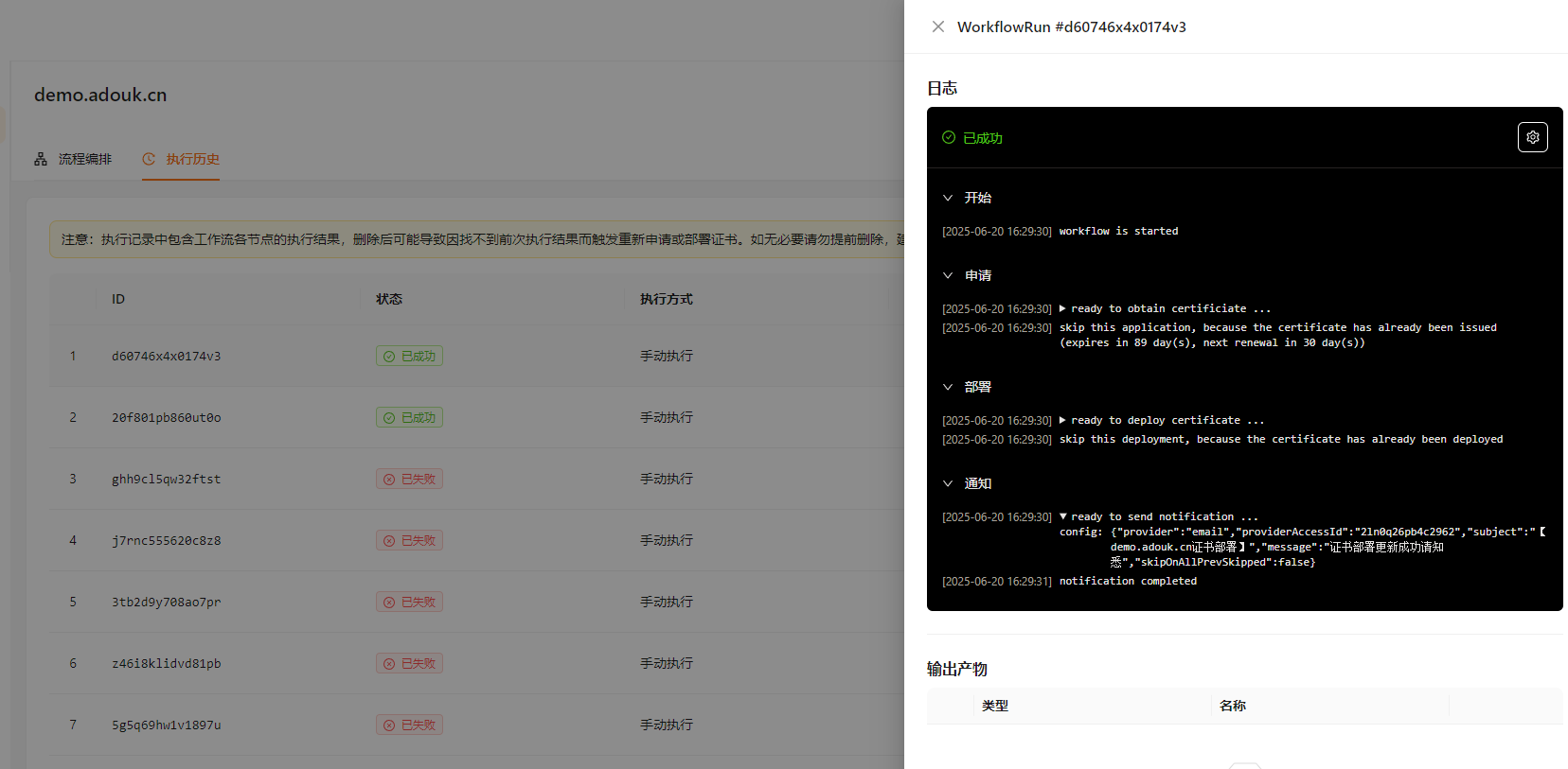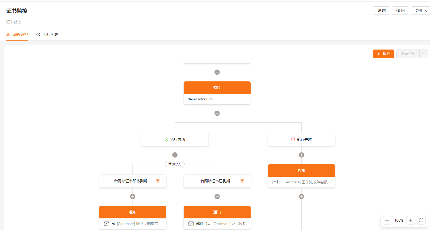 https://github.com/usual2970/certimate/releases/download/v0.3.18/certimate_v0.3.18_linux_amd64.zip <h1 align="center">🔒 Certimate</h1> <div align="center"> [](https://github.com/usual2970/certimate) [](https://github.com/usual2970/certimate) [](https://hub.docker.com/r/usual2970/certimate) [](https://github.com/usual2970/certimate/releases) [](https://mit-license.org/) </div> <div align="center"> 中文 | [English](README_EN.md) </div> --- ## 🚩 项目简介 做个人产品或者在中小企业里负责运维的同学,会遇到要管理多个域名的情况,需要给域名申请证书。但是手动申请证书有以下缺点: - 😱 麻烦:申请证书并部署到服务的流程虽不复杂,但也挺麻烦的,尤其是你有多个域名需要维护的时候。 - 😭 易忘:另外当前免费证书的有效期只有 90 天,这就要求你定期的操作,增加了工作量的同时,你也很容易忘掉续期,从而导致网站访问不了。 Certimate 就是为了解决上述问题而产生的,它具有以下优势: - **本地部署**:一键安装,只需要下载二进制文件,然后直接运行即可。同时也支持 Docker 部署、源代码部署等方式。 - **数据安全**:由于是私有部署,所有数据均存储在自己的服务器上,不会经过第三方,确保数据的隐私和安全。 - **操作简单**:简单配置即可轻松申请 SSL 证书并部署到指定的目标上,在证书即将过期前自动续期,从申请证书到使用证书完全自动化,无需人工操作。 Certimate 旨在为用户提供一个安全、简便的 SSL 证书管理解决方案。 ## 💡 功能特性 - 灵活的工作流编排方式,证书从申请到部署完全自动化; - 支持单域名、多域名、泛域名证书,可选 RSA、ECC 签名算法; - 支持 PEM、PFX、JKS 等多种格式输出证书; - 支持 30+ 域名托管商(如阿里云、腾讯云、Cloudflare 等,[点此查看完整清单](https://docs.certimate.me/docs/reference/providers#supported-dns-providers)); - 支持 100+ 部署目标(如 Kubernetes、CDN、WAF、负载均衡等,[点此查看完整清单](https://docs.certimate.me/docs/reference/providers#supported-hosting-providers)); - 支持邮件、钉钉、飞书、企业微信、Webhook 等多种通知渠道; - 支持 Let's Encrypt、Buypass、Google Trust Services、SSL.com、ZeroSSL 等多种 ACME 证书颁发机构; - 更多特性等待探索。 ## ⏱️ 快速启动 **5 分钟部署 Certimate!** 以二进制部署为例,从 [GitHub Releases](https://github.com/usual2970/certimate/releases) 页面下载预先编译好的二进制可执行文件压缩包,解压缩后在终端中执行: ```bash ./certimate serve ``` 浏览器中访问 `http://127.0.0.1:8090`。 初始的管理员账号及密码: - 账号:`admin@certimate.fun` - 密码:`1234567890` 即刻使用 Certimate。 如何使用 Docker 或其他部署方式请参考文档。 ## 📄 使用手册 请访问文档站 [docs.certimate.me](https://docs.certimate.me/) 以阅读使用手册。 相关文章: - [使用 CNAME 完成 ACME DNS-01 质询](https://docs.certimate.me/blog/cname) - [v0.3.0:第二个不向后兼容的大版本](https://docs.certimate.me/blog/v0.3.0) - [v0.2.0:第一个不向后兼容的大版本](https://docs.certimate.me/blog/v0.2.0) - [Why Certimate?](https://docs.certimate.me/blog/why-certimate) ## ⭐ 运行界面 [](https://www.bilibili.com/video/BV1xockeZEm2) ## 实战演示-阿里云续签 # 准备工作-阿里云账号授权 在RAM 访问控制创建一个用户,并授权AliyunDNSFullAccess权限,留存AccessKey ID和Secret   # 授权管理配置 填写阿里云上申请到的用户key信息  主机信息就写到本地机器上,用于上传证书和更新操作  设置通知渠道,比如邮箱,企业微信等  证书颁发机构这里就使用免费内置的lets证书,其他收费的需要填写相关认证信息 # 工作流证书申请   根据实际工作场景配置工作流 开始,设定自动触发和手动触发模式,一般建议自动,选择更新时间即可  证书申请,域名可以是单个也可以是通配符证书,DNS的等待检查时间需要配置上,阿里云需要较长时间,超时后则会异常  比如未填写等待时长,出现下面的错误  根据定义设置部署成功或失败的通知对象,完成后进行发布,然后执行,或自动运行  在右侧有执行历史,可以查看执行的日志  # 证书管理  # 证书监控通知