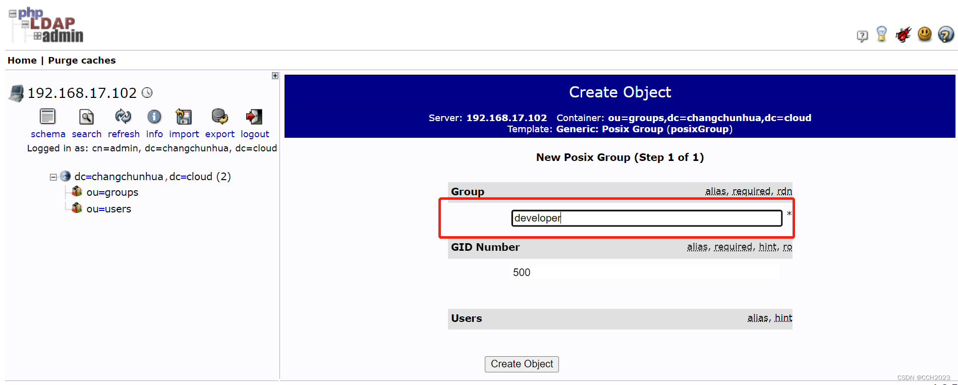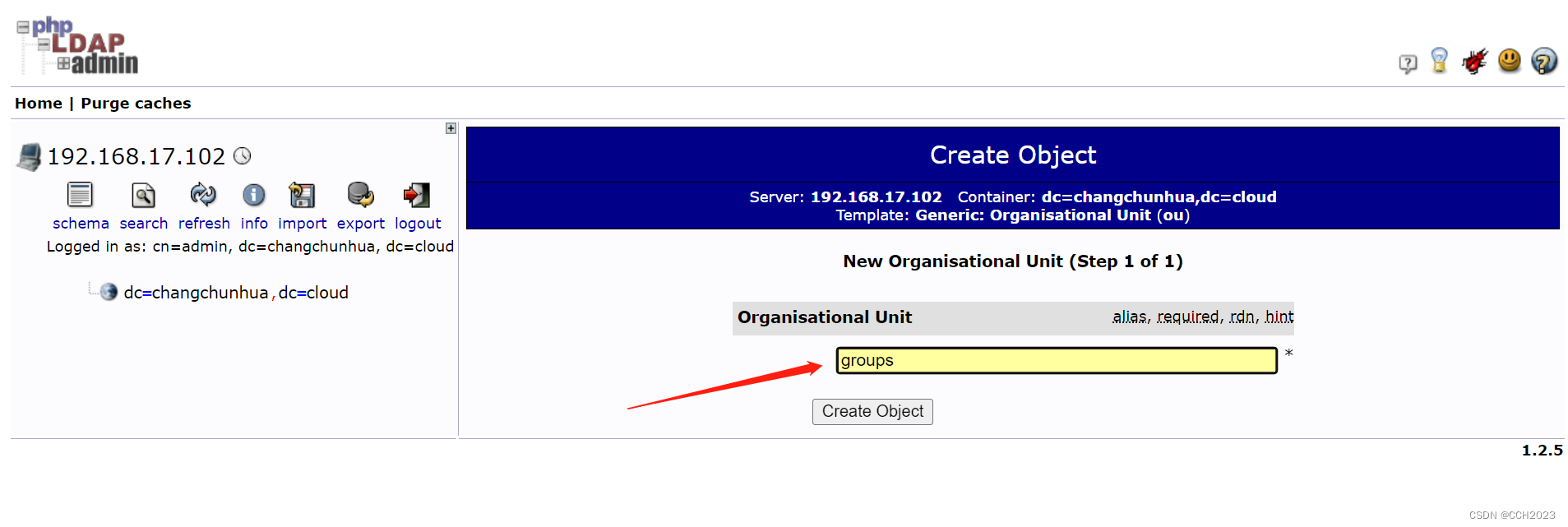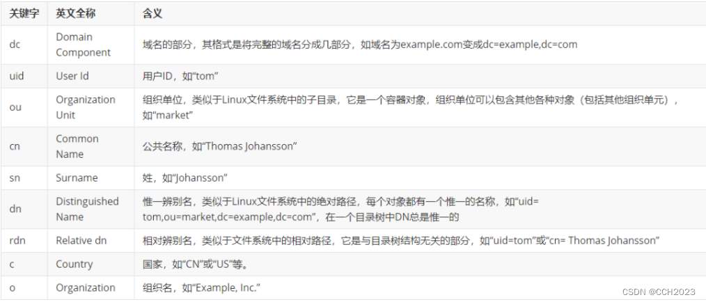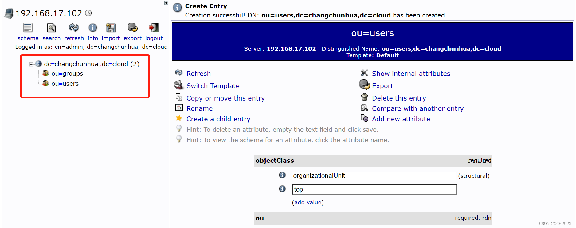 1、[LDAP](https://so.csdn.net/so/search?q=LDAP&spm=1001.2101.3001.7020)概念: LDAP是轻量级目录访问协议,英文全称是:LightWeight Directory Access Protocol,一般称为LDAP。 按照我们对文件目录的理解,LDAP可以看成是一个文件系统,类似目录和文件树。 2、LDAP软件: LDAP是一个协议。 LDAP产品:Microsoft的ActiveDrectory,Lotus的Domino Directory、[IBM](https://so.csdn.net/so/search?q=IBM&spm=1001.2101.3001.7020)的WebSphere中也集成了LDAP服务。 LDAP的开源实现是OpenLDAP。 3、OpenLDAP介绍: OpenLDAP是最常用的目录服务之一,提供了目录服务的所有功能,包括目录搜索,身份认证、安全通道、过滤器等。 大多数的Linux发行版里面都带有OpenLDAP的安装包。 OpenLDAP服务默认是使用非加密的TCP/IP协议来接收服务的请求,并将查询结果传到客户端。 由于大多数目录服务都是用于系统的安全认证部分比如:用户登录和身份验证,所以它也支持使用基于SSL/TLS的加密协议来保证数据传送的保密性和完整性。 OpenLDAP是使用的OpenSSL来实现SSL/TLS的加密通信的。 4、LDAP的信息模型: LDAP的信息模型是建立在目录entries的基础上。 一个条目是一些属性的集合,并且具有一个全局唯一性的可区分名称DN, 一个条目可以通过DN来引用。 每一个条目的属性具有一个类型和一个或多个值。 类型通常是容易记忆的名称,比如cn是通用名称common name,或者mail是电子邮件。 条目的值的语法取决于属性类型。比如cn属性可能具有一个值“Babs Jensen”。 一个mail属性可能包括"test@123.com” 5、LDAP的objectClass LDAP通过属性objectClass来控制哪一个属性必须出现或允许出现在一个条目中,它的值决定了该条目必须遵守的模式规则。可以理解为关系数据库的表结构。  6、LDAP的常用关键字: LDAP的entry是由各种字段构成,可以理解为关系数据库的字段。  7、OpenLDAP的部署: 7.1 拉取相关镜像: ``` docker pull osixia/openldap docker pull osixia/phpldapadmin ``` 7.2 运行容器openldap: ``` docker run -d -p 389:389 -p 636:636 -v /usr/local/ldap:/usr/local/ldap -v /data/openldap/ldap:/var/lib/ldap -v /data/openldap/slapd.d:/etc/ldap/slapd.d --env LDAP_ORGANISATION="changchunhua" --env LDAP_DOMAIN="changchunhua.cloud" --env LDAP_ADMIN_PASSWORD="123456" --name openldap --hostname openldap-host --network bridge osixia/openldap ``` \-v /data/openldap/ldap:/var/lib/ldap:将数据持久化到本地 \-p 389:389 \\ TCP/IP 访问端口,-p 636:636 \\ SSL 连接端口。 –name your\_ldap 自行设置容器名称 –network bridge 连接默认的 bridge 网络(docker0) –hostname openldap-host 设置容器主机名称为 openldap-host –env LDAP\_ORGANISATION=“changchunhua” 配置 LDAP 组织名称 –env LDAP\_DOMAIN=“changchunhua.cloud” 配置 LDAP 域名 –env LDAP\_ADMIN\_PASSWORD=“123456” 配置 LDAP 密码 默认登录用户名:admin 7.3 运行容器phpldapadmin: ``` docker run -p 8080:80 --privileged --name phpldapadmin --env PHPLDAPADMIN_HTTPS=false --env PHPLDAPADMIN_LDAP_HOSTS=192.168.17.102 --detach osixia/phpldapadmin ``` –privileged 特权模式启动(使用该参数,container 内的 root 拥有真正的 root 权限。 否则,container 内的 root 只是外部的一个普通用户权限。) –env PHPLDAPADMIN\_HTTPS=false 禁用 HTTPS –env PHPLDAPADMIN\_LDAP\_HOSTS =192.168.17.102 配置 openLDAP 的 IP 或者域名,我的 - openLDAP 是在虚拟机192.168.17.102启动。 此处设置访问端口为 8080,可自行更改访问端口号 可开启 443 端口 -p 443:443 7.4 浏览器访问http://192.168.17.102:8080:  输入登录: Login DN:cn=admin, dc=changchunhua, dc=cloud Password:123456  登录后的页面显示如下:  8、OpenLDAP用户创建: 创建OpenLDAP基础域: 第一步:点击dc=changchunhua,dc=cloud,然后点击Create a child entry:  第二步:点击 Generic:Organisational Unit: 创建groups: 同样的方式再创建users: 创建openldap组: